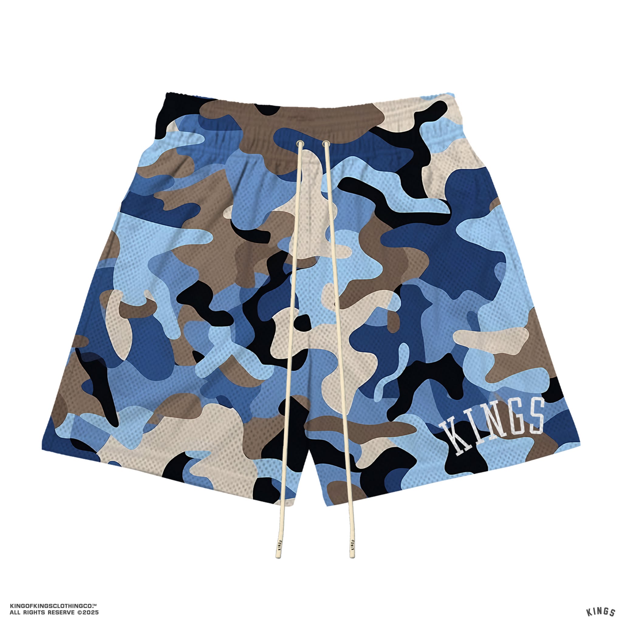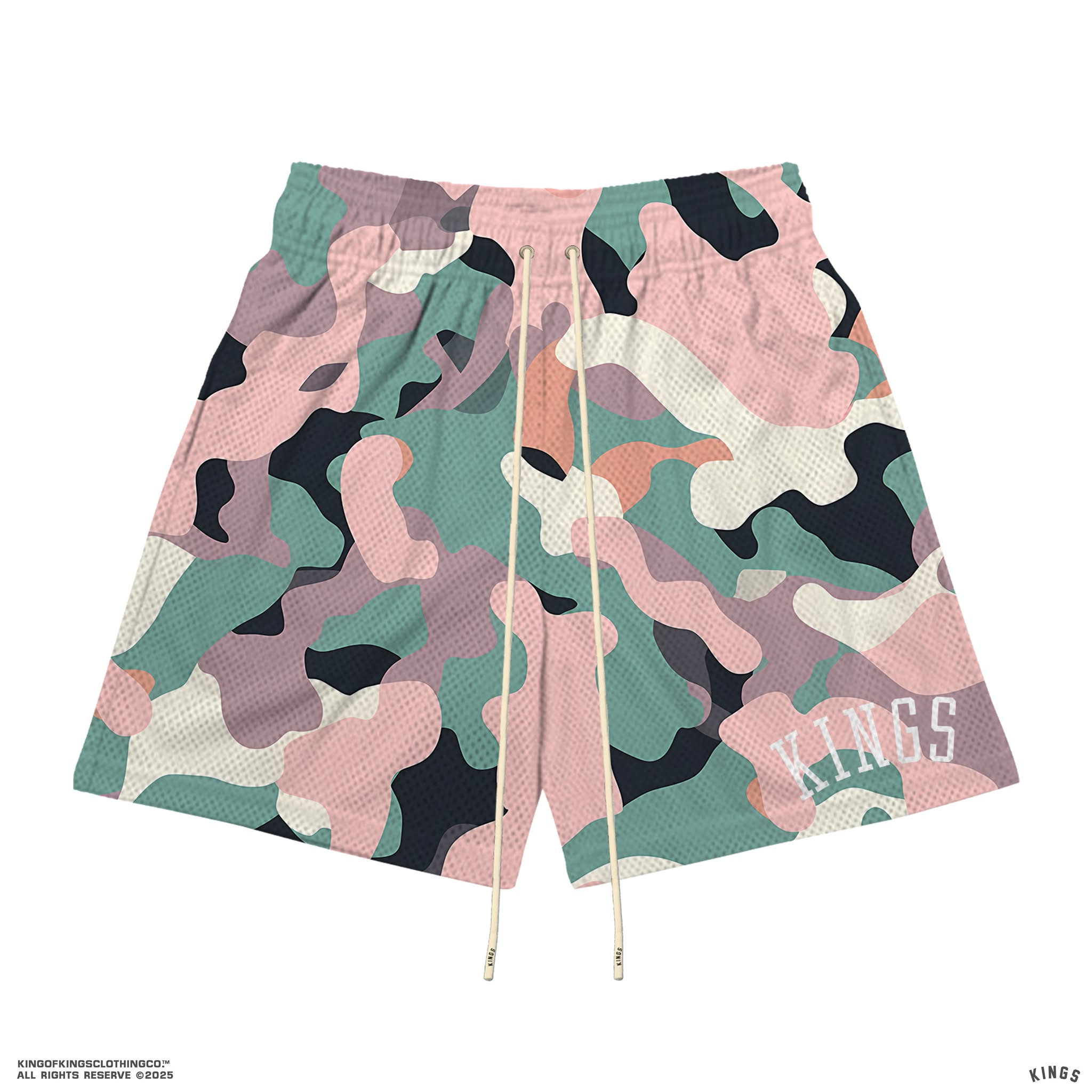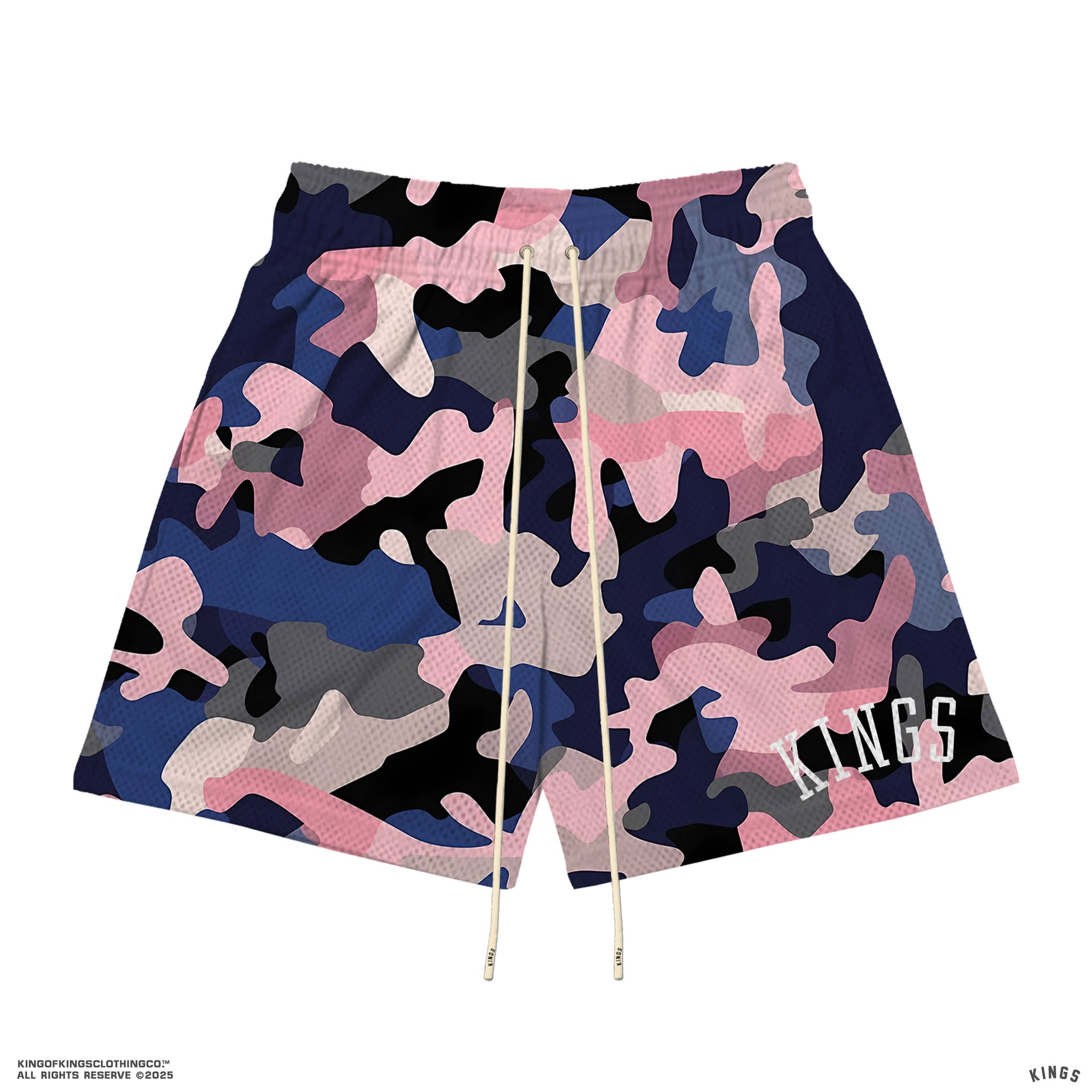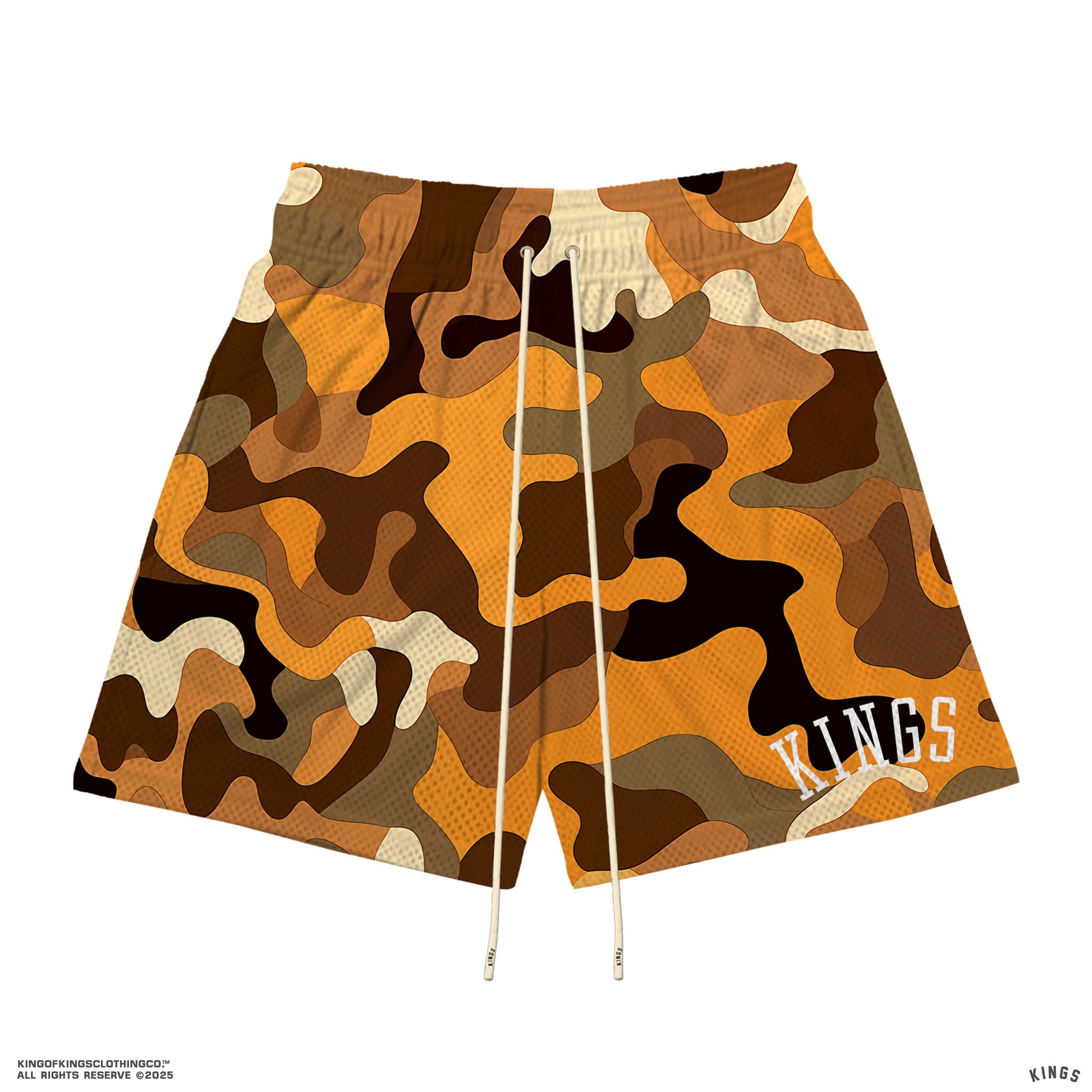 These Kings® Camo Mesh Shorts are crafted from 100% polyester for a lightweight, breathable feel that stays comfortable on and off the court. Finished with bold printed branding and long elastic drawstrings for a secure, adjustable fit. Perfect for training, daily wear, or street-ready layering.