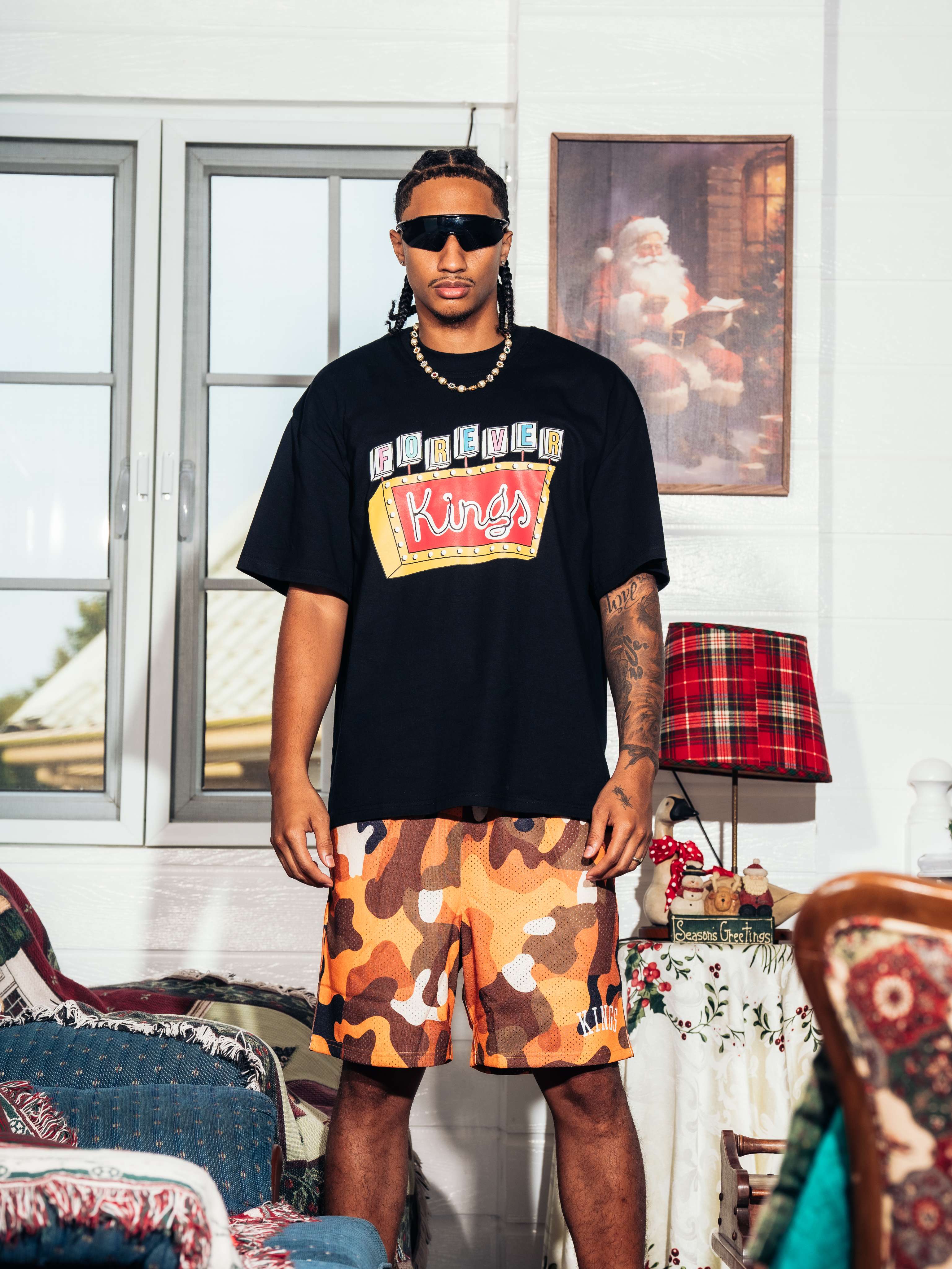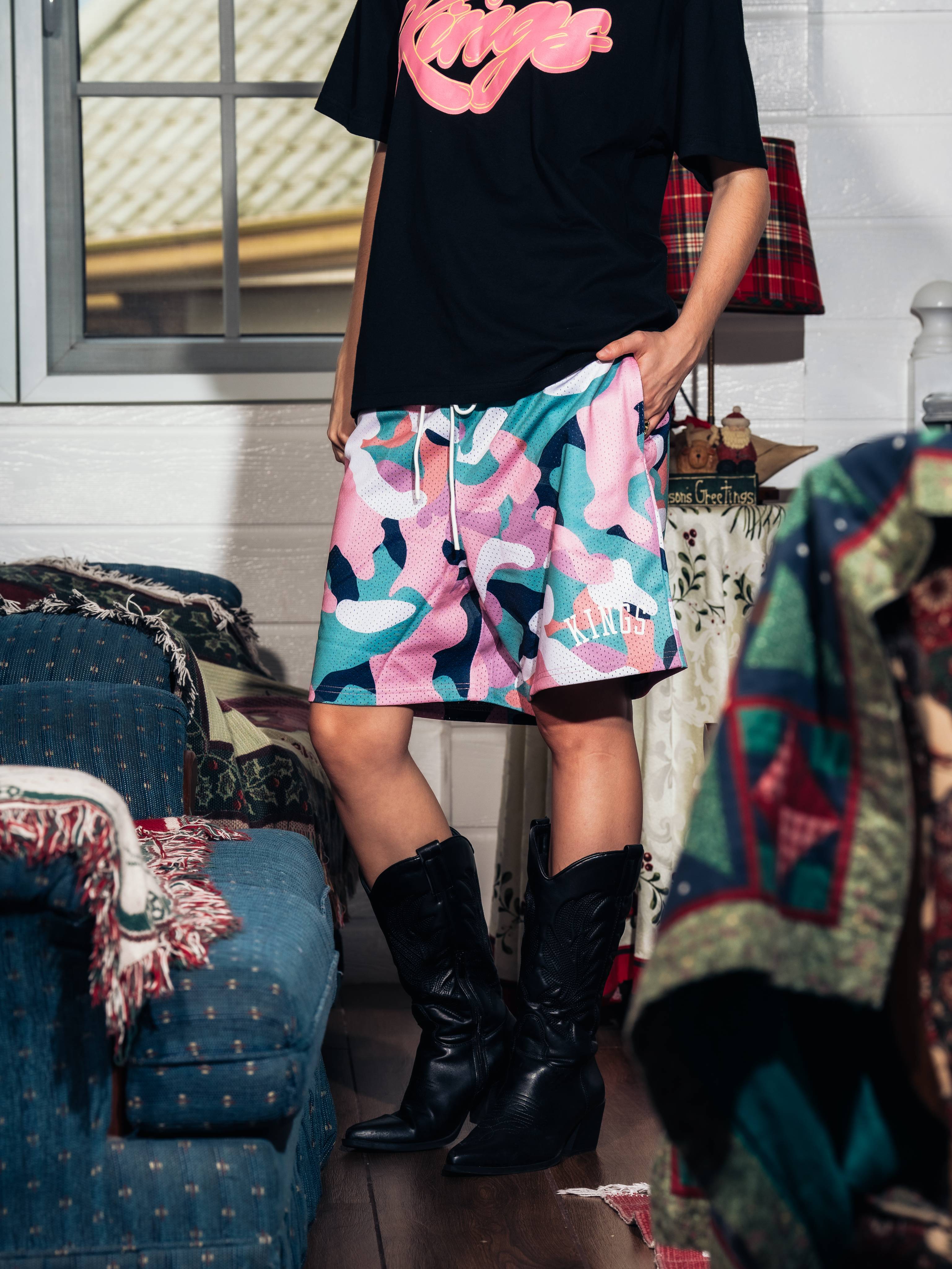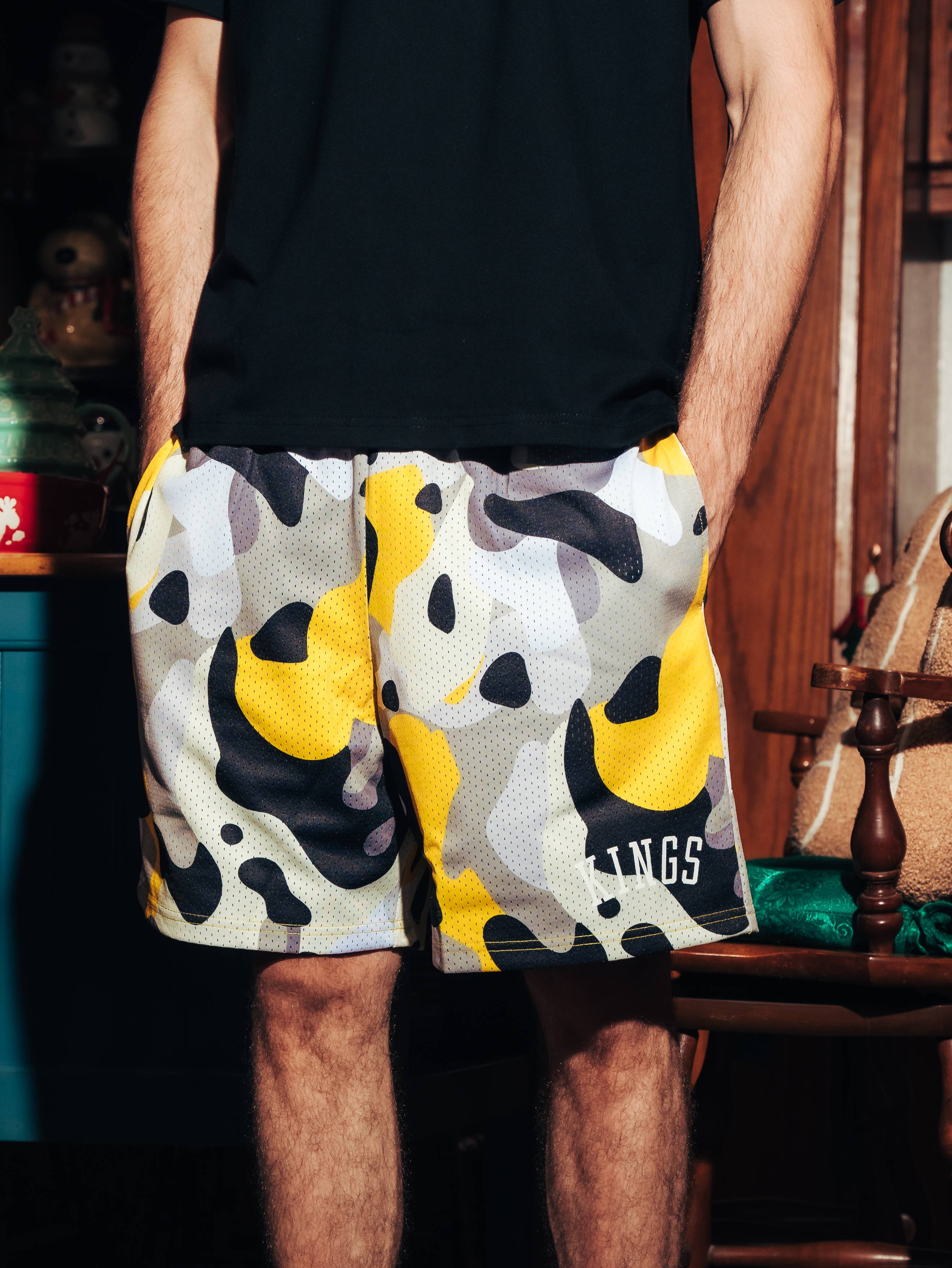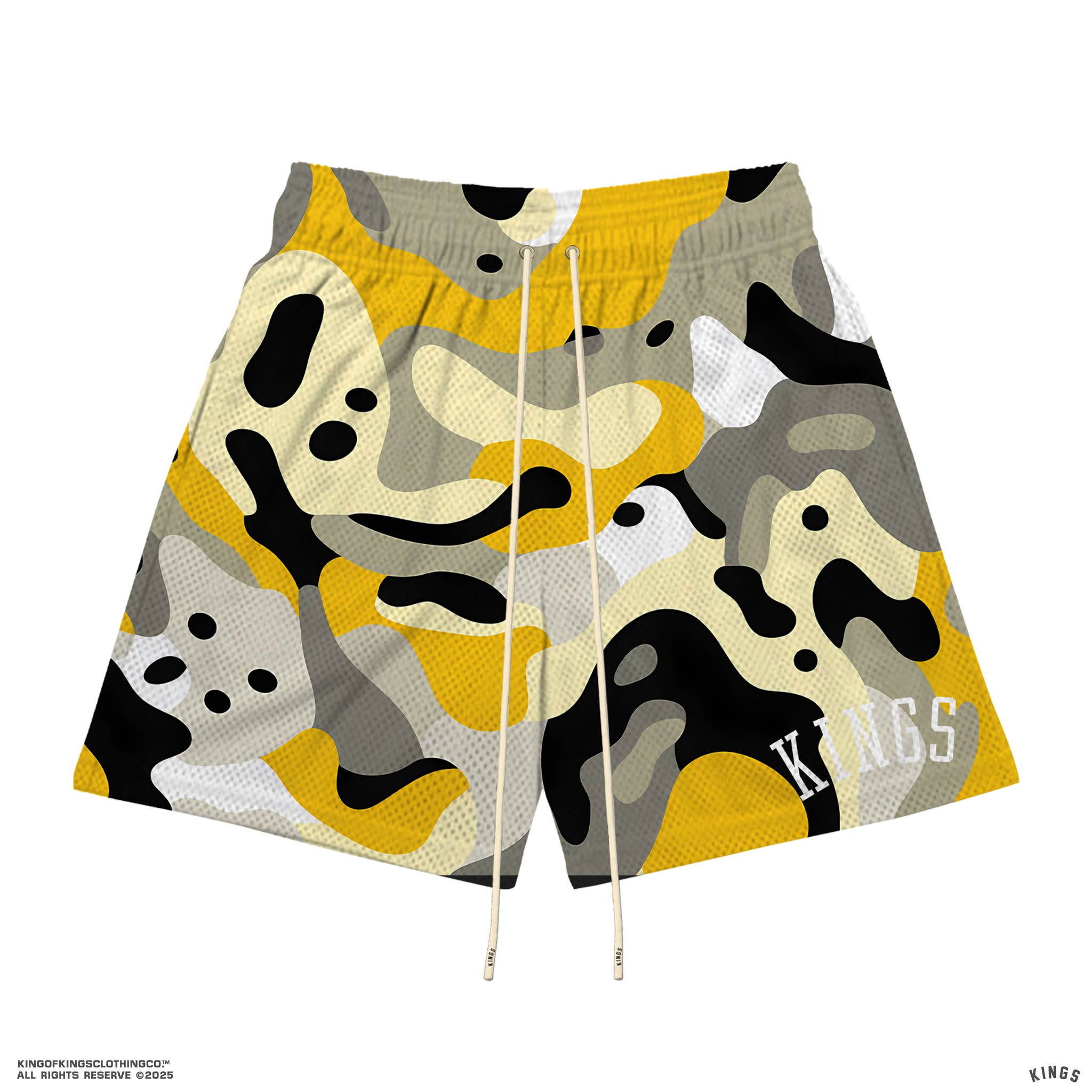 These Kings® Camo Mesh Shorts are crafted from 100% polyester for a lightweight, breathable feel that stays comfortable on and off the court. Finished with bold printed branding and long elastic drawstrings for a secure, adjustable fit. Perfect for training, daily wear, or street-ready layering.